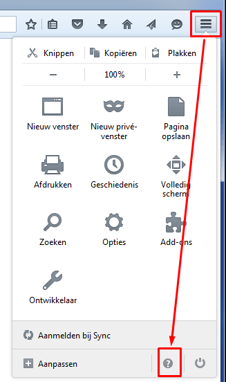 Open het instellingen-menu van Firefox en klik op het help-icoontje: