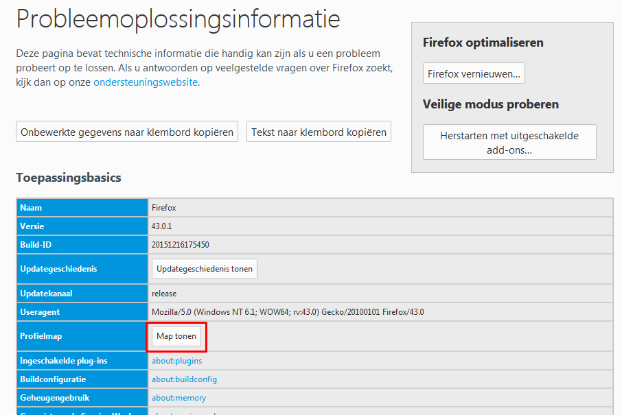 Firefox opent een nieuwe tab met onderstaande informatie. Klik op de knop 'Map tonen':